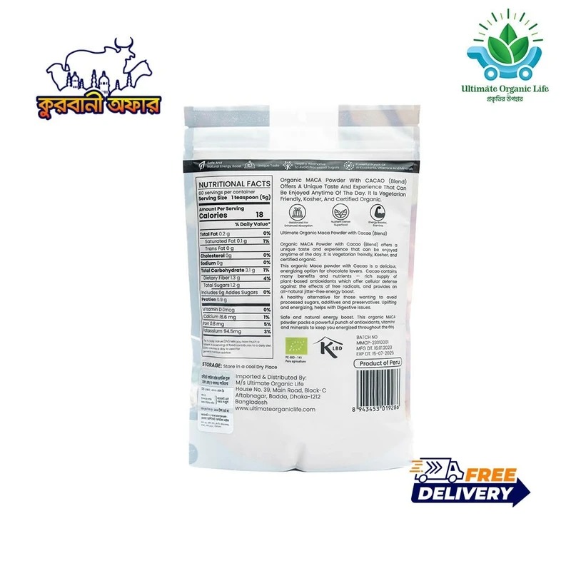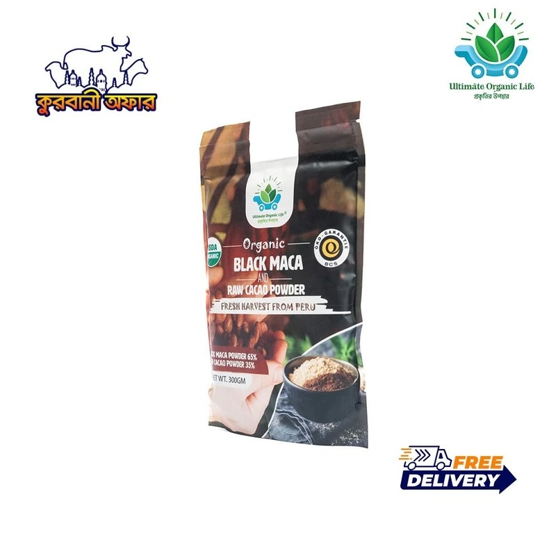 আল্টিমেট অর্গানিক লাইফ অর্গানিক ব্ল্যাক মাকা ও কাকাও ব্লেন্ড হল একটি প্রাকৃতিক এবং স্বাস্থ্যকর পাউডার, যা ব্ল্যাক মাকা রুট এবং খাঁটি কাকাও থেকে প্রস্তুত করা হয়েছে। এটি পুষ্টিগুণ সমৃদ্ধ এবং শরীরের শক্তি, সহনশীলতা এবং মানসিক সতেজতা বাড়াতে সহায়ক।